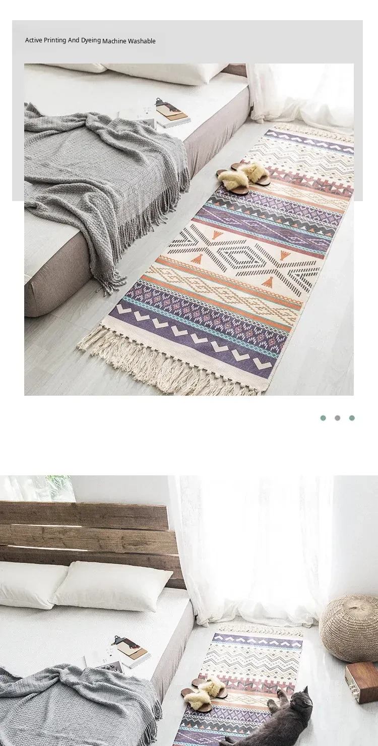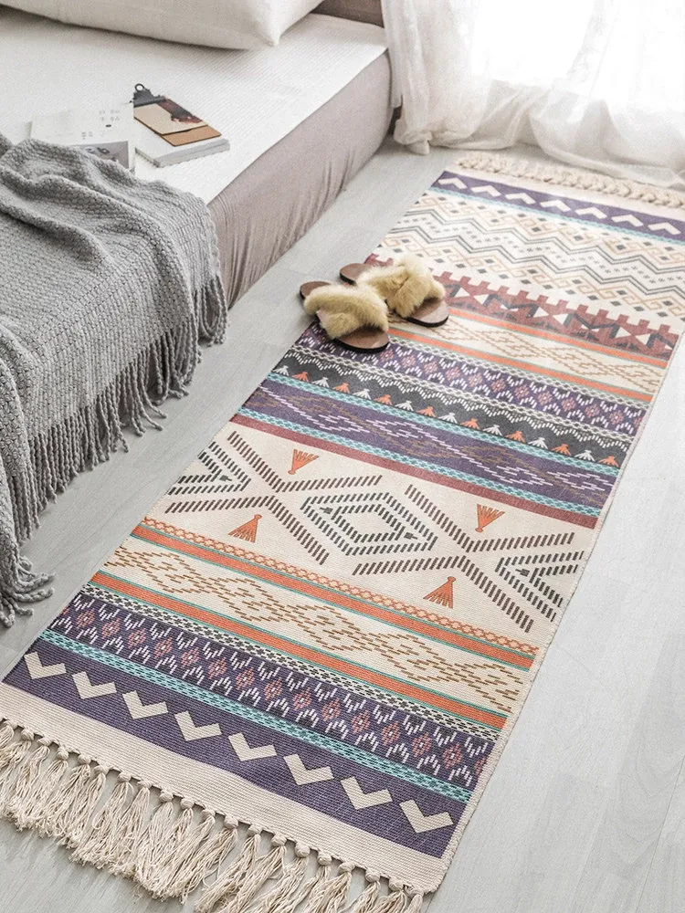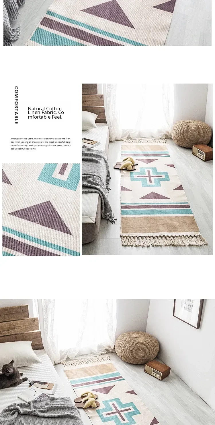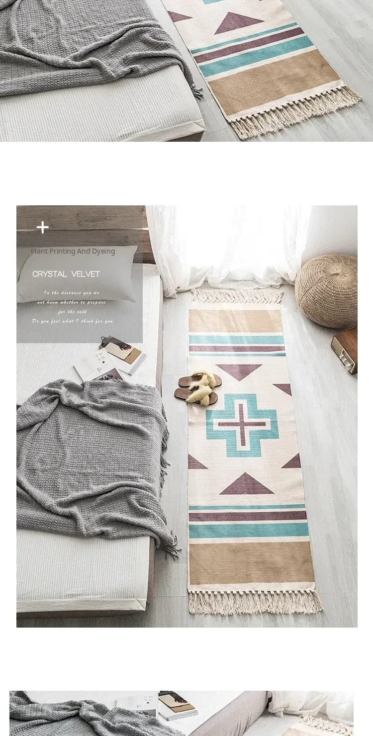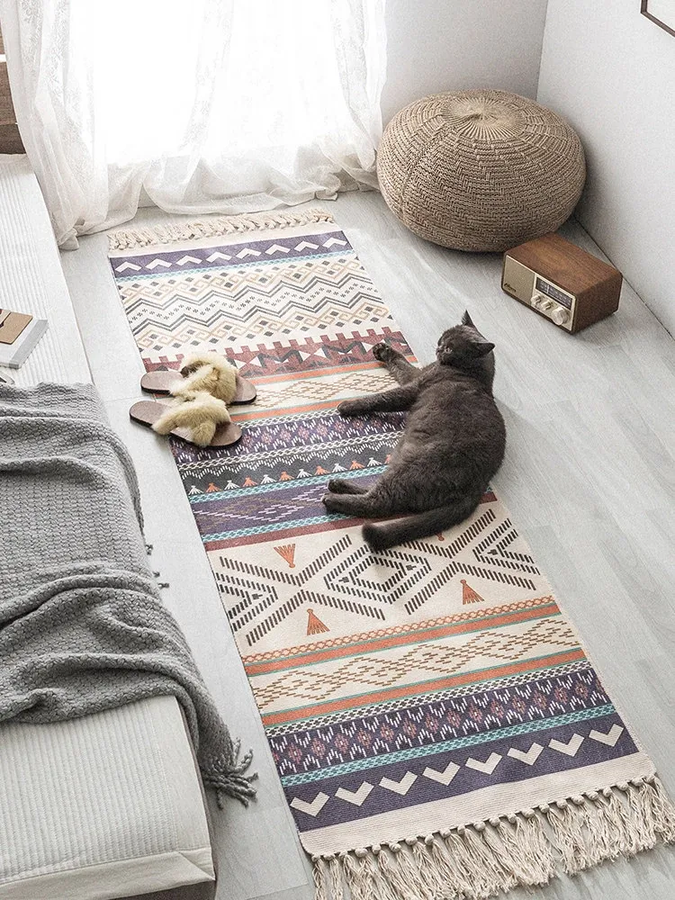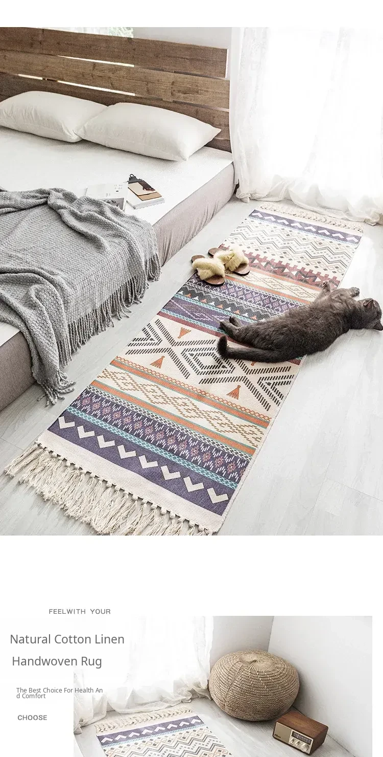 Bohemian Cotton Linen Bedroom Bedside Runner Rug - Long Carpet for Living Room Sofa, Tatami Mat, Machine Washable