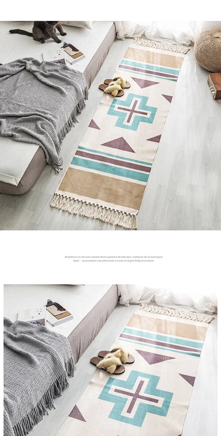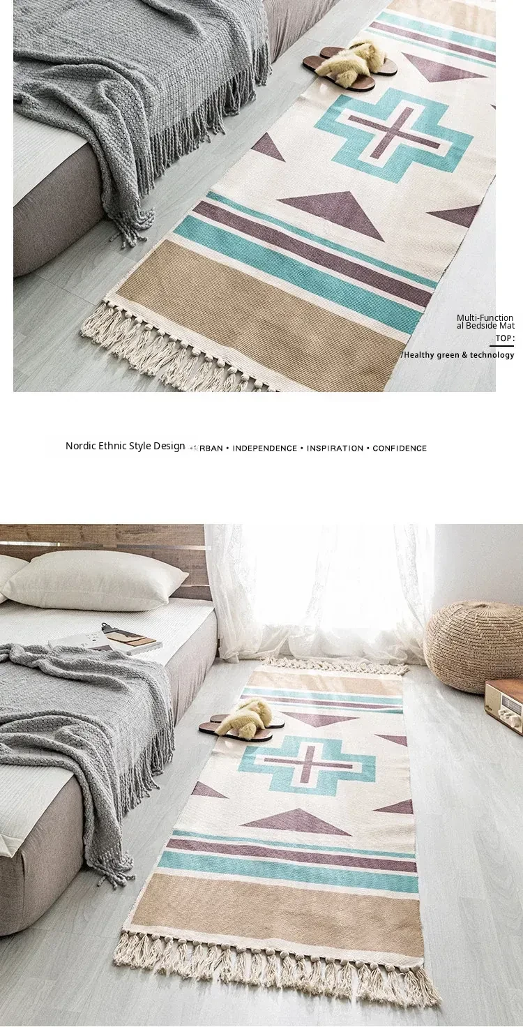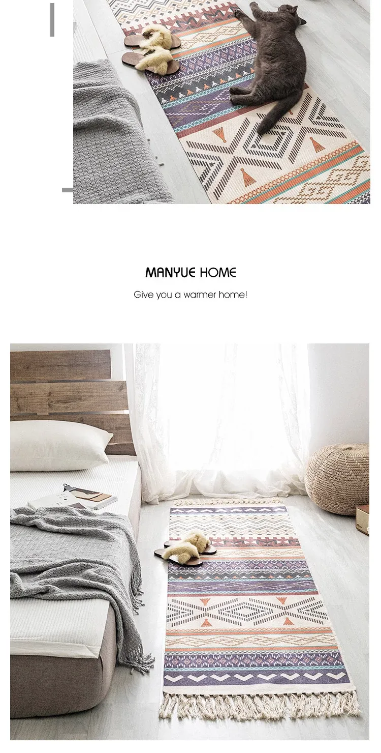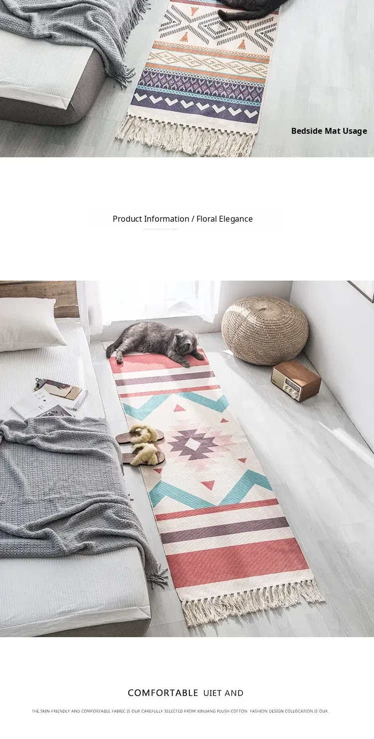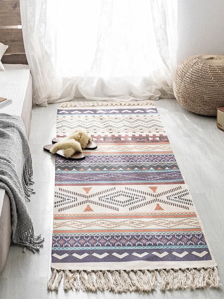 Bohemian Cotton Linen Bedroom Bedside Runner Rug - Long Carpet for Living Room Sofa, Tatami Mat, Machine Washable