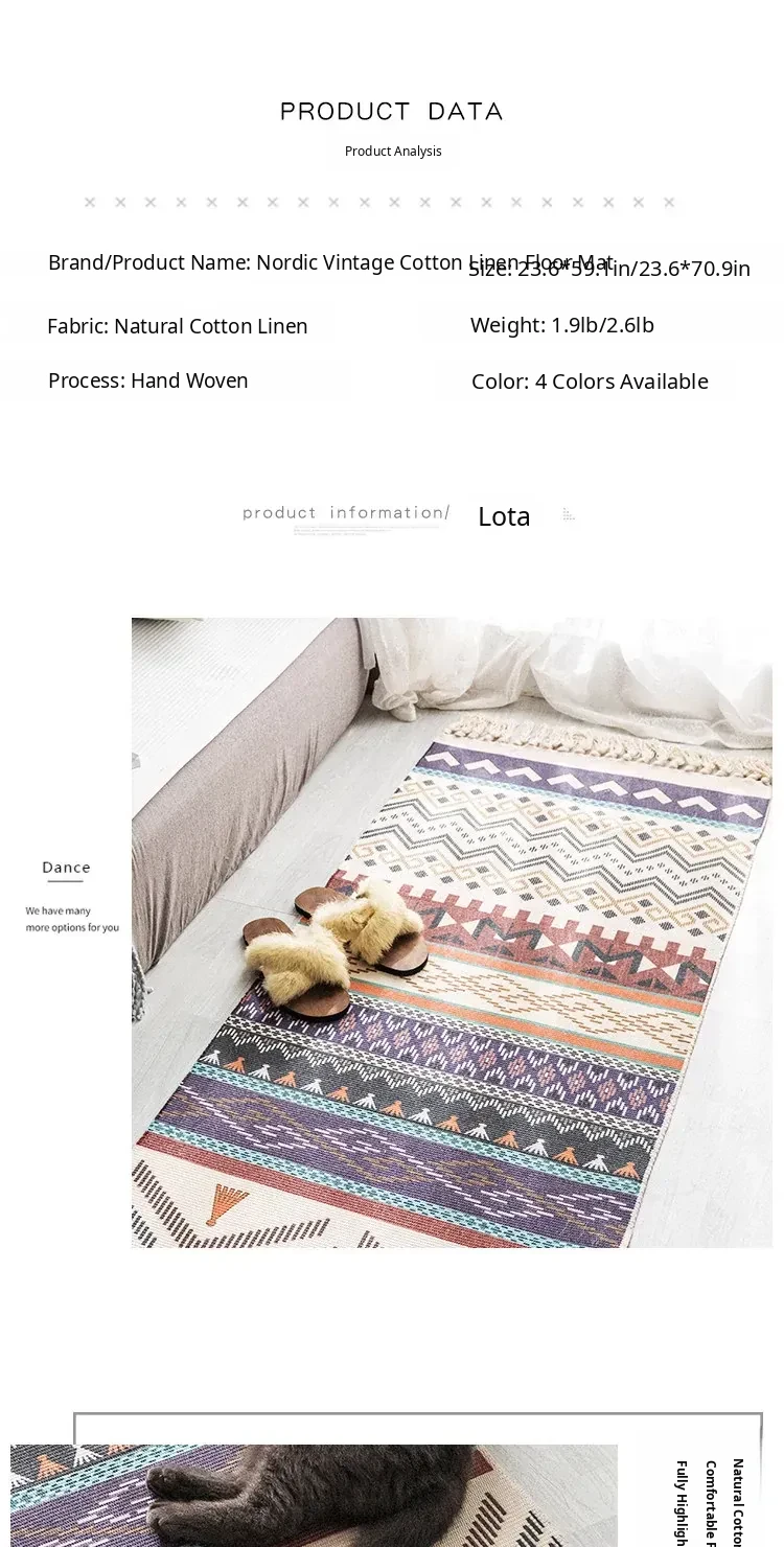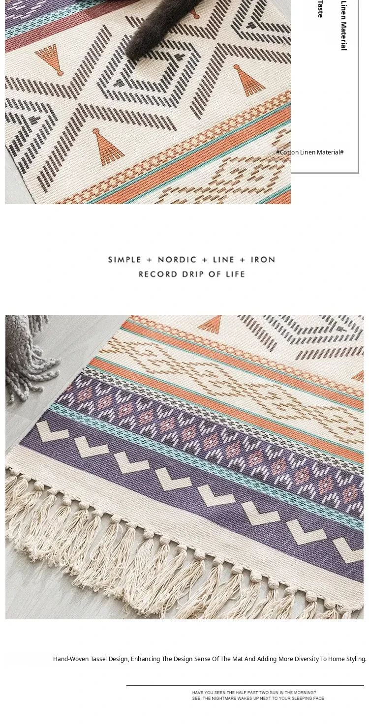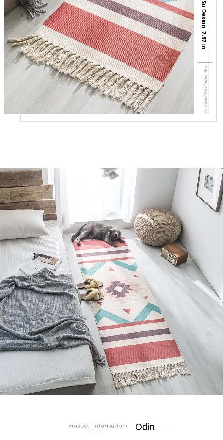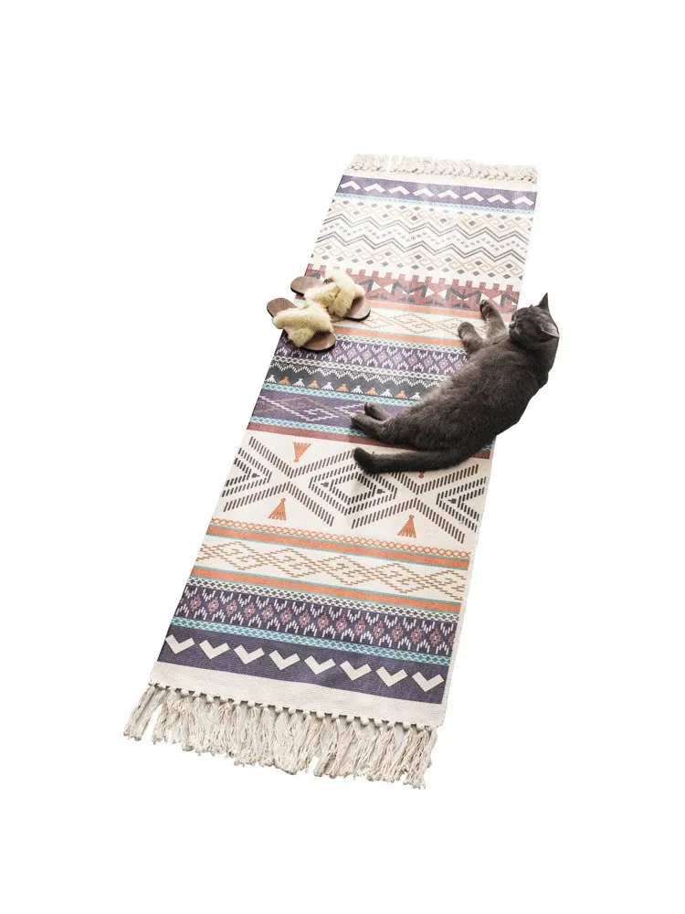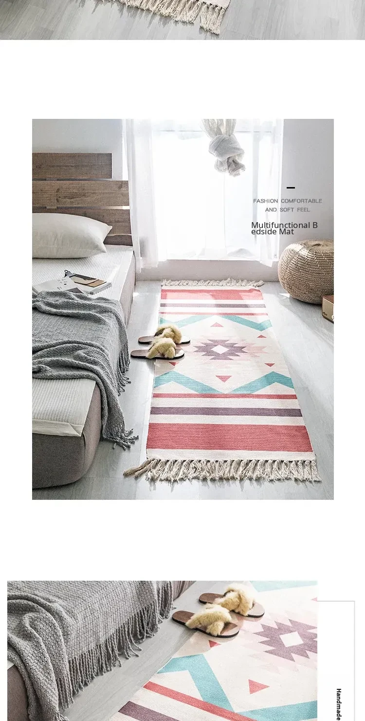 Bohemian Cotton Linen Bedroom Bedside Runner Rug - Long Carpet for Living Room Sofa, Tatami Mat, Machine Washable