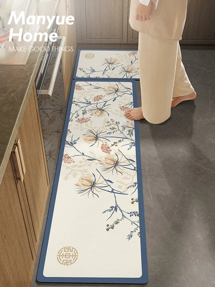 Cranberry Home Traditional Style Floral Blue Kitchen Mat - Non-Slip, Oil-Resistant, Washable Rug, Waterproof and Dirt-Repellent Floor Mat